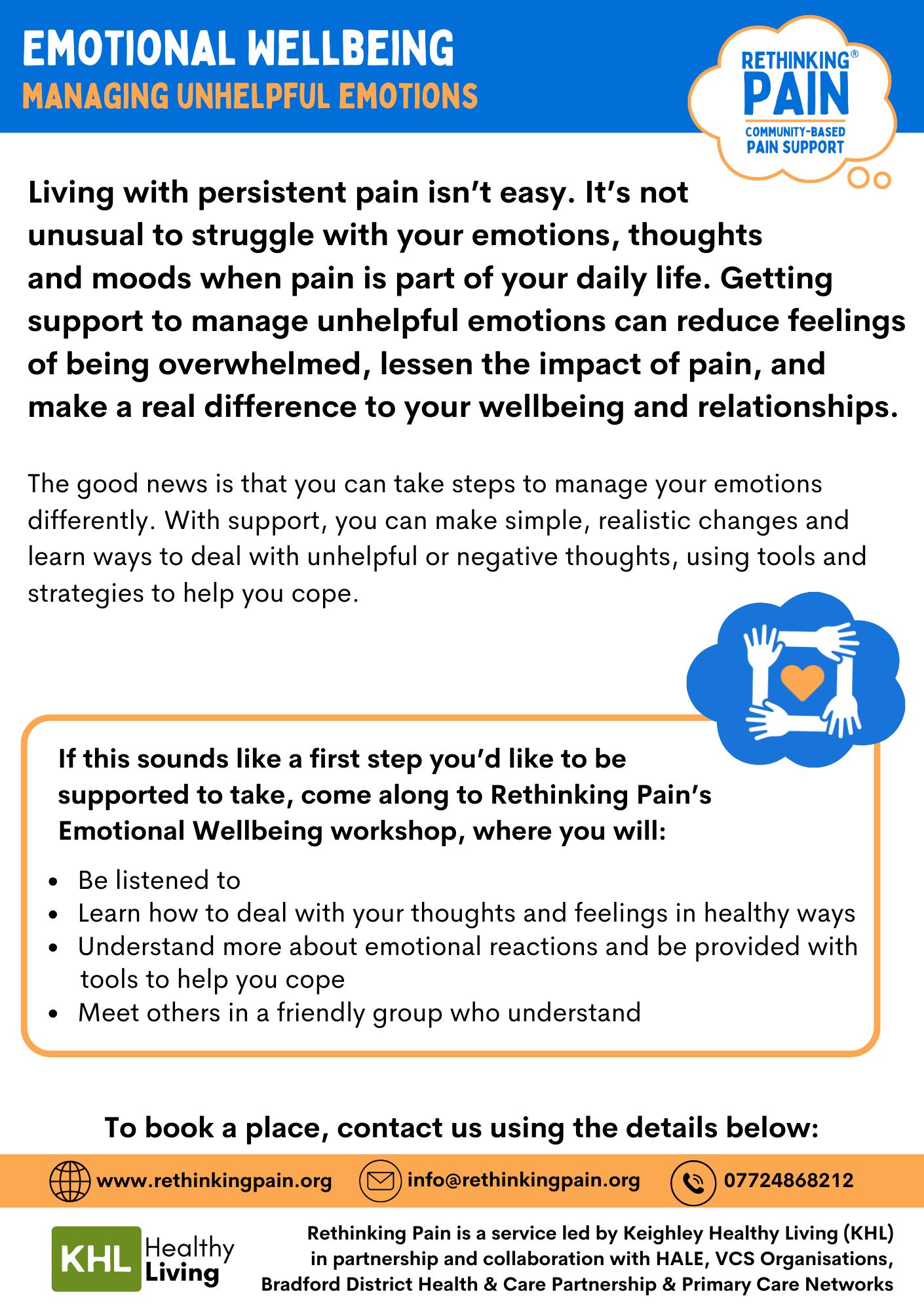 If this sounds like a first step you’d like to be supported to take, come along to Rethinking Pain’s Emotional Wellbeing workshop, where you will: